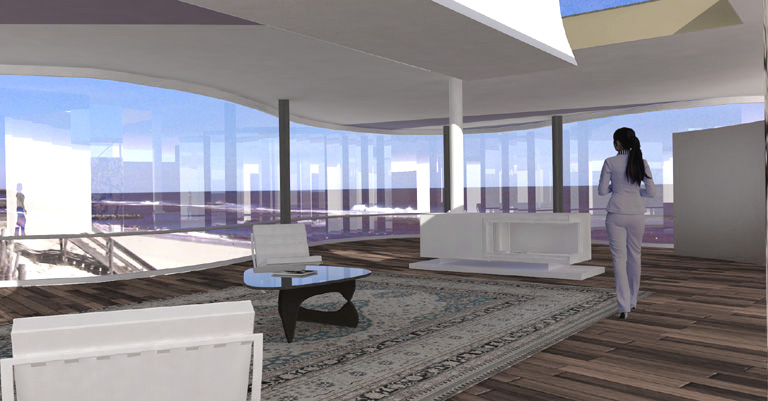 Contemporary Interior Design / Condominium or Residential Design Strategy. Inteior with Undulating Glass Facade and Skylight Monitors merging Display of Fine Art with Residential Space connected to Setting;