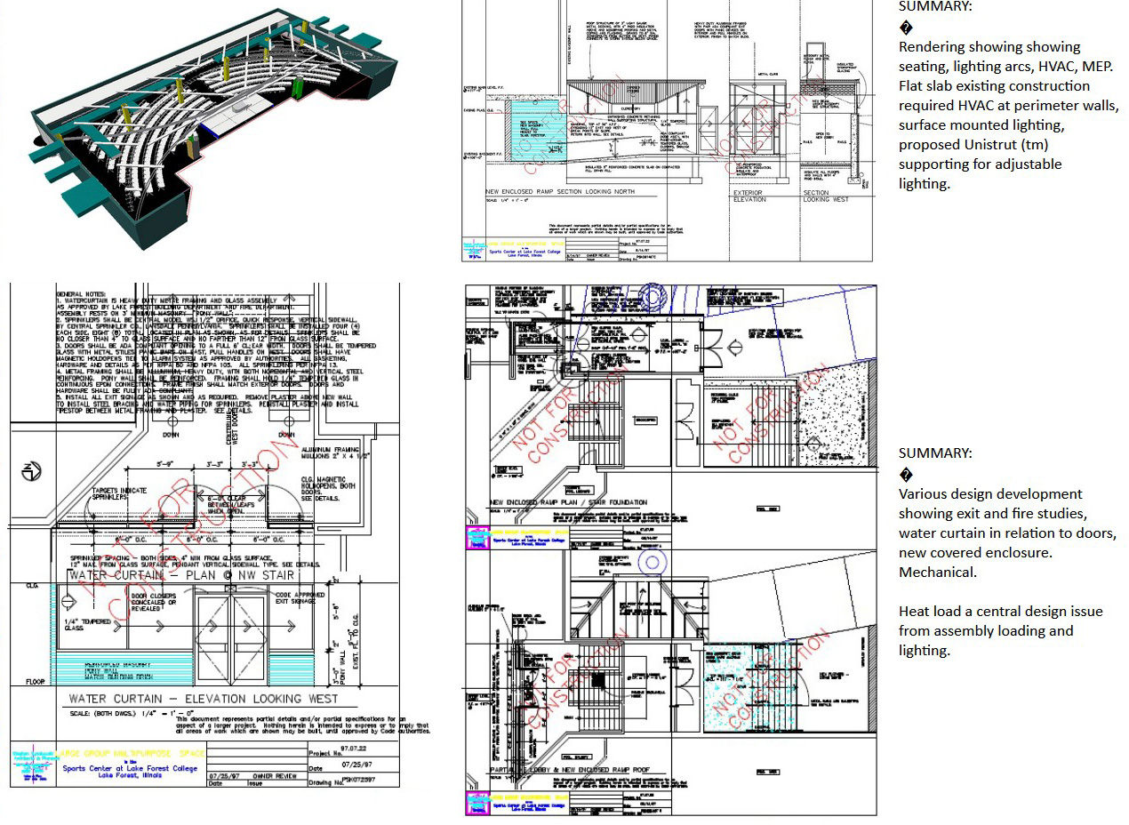 Designs are large scale and include reconfiguation of large floor plans for new programs and vertical building additions, both spanning with steel frame and superimposed massonry.
